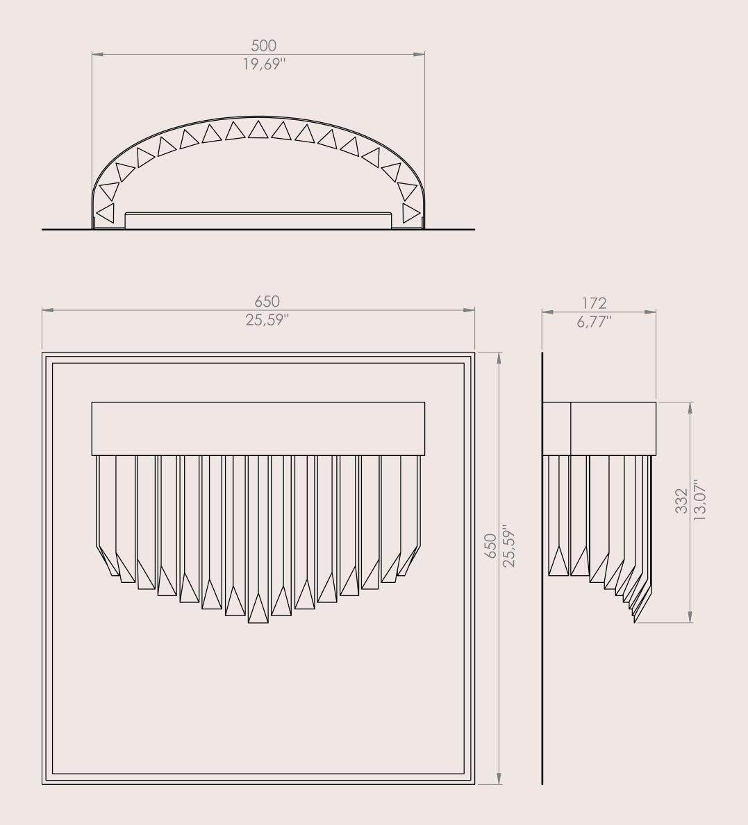 | Note | Disegno tecnico, dimensioni e lampadine si riferiscono alla variante della foto principale. Le dimmerazioni a richiesta potrebbero comportare l'aumento delle dimensioni del rosone. Per varianti cromatiche disponibili, consultare la scheda tecnica. |