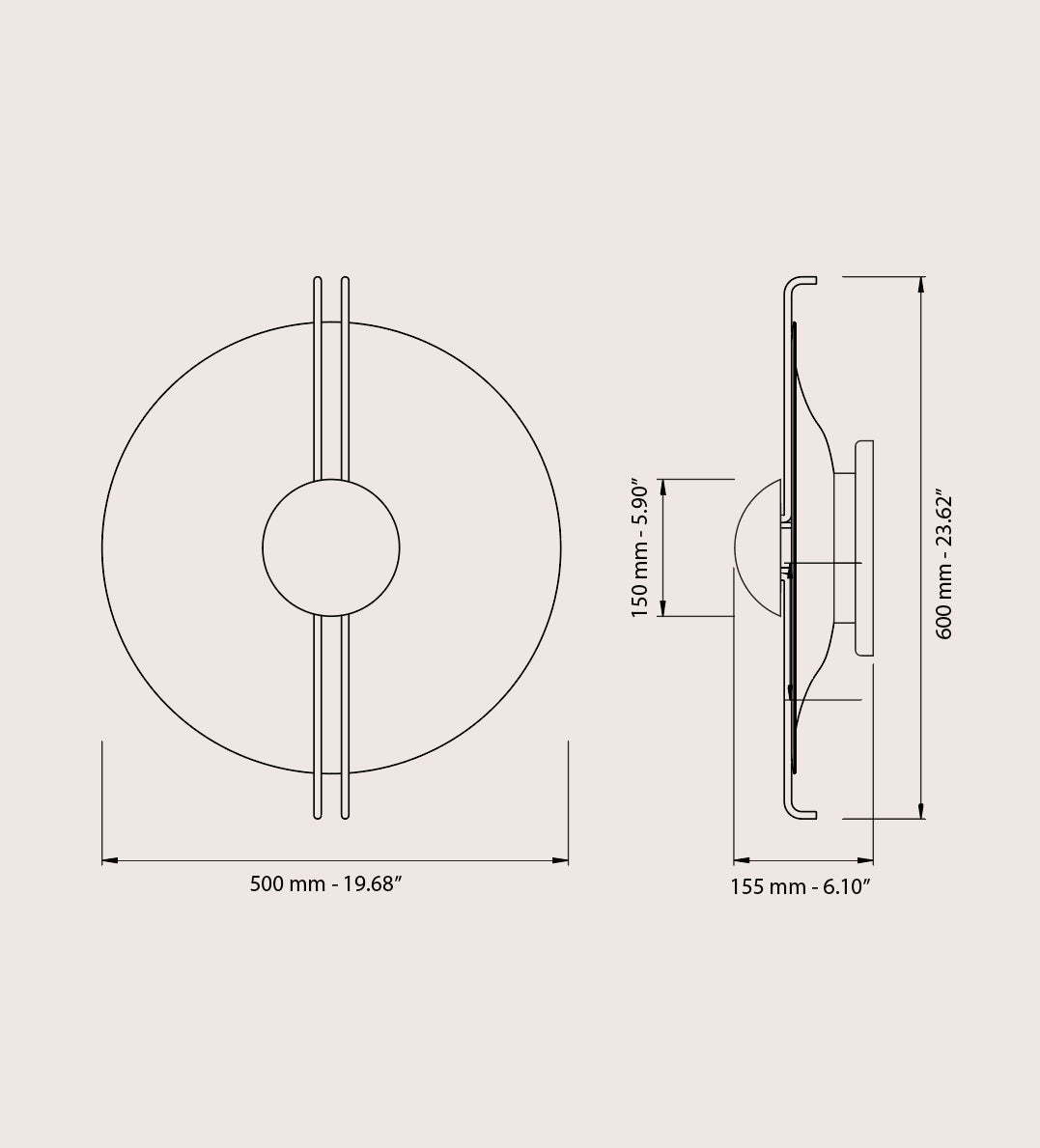 | Note | Disegno tecnico, dimensioni e lampadine si riferiscono alla variante della foto principale. Le dimmerazioni a richiesta potrebbero comportare l'aumento delle dimensioni del rosone. Per varianti cromatiche disponibili, consultare la scheda tecnica. |