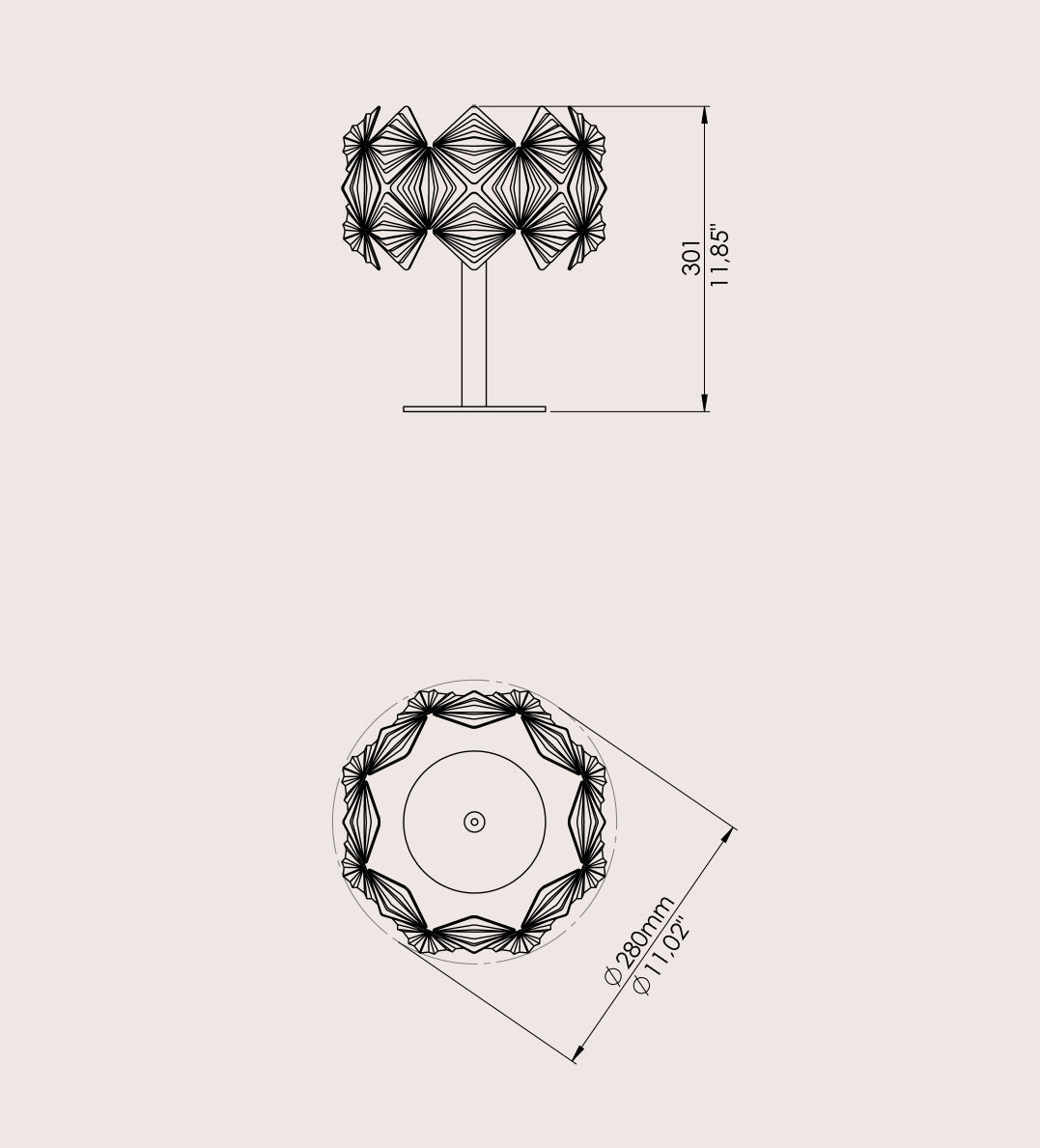 | Note | Disegno tecnico, dimensioni e lampadine si riferiscono alla variante della foto principale. Le dimmerazioni a richiesta potrebbero comportare l'aumento delle dimensioni del rosone. Per varianti cromatiche disponibili, consultare la scheda tecnica. |