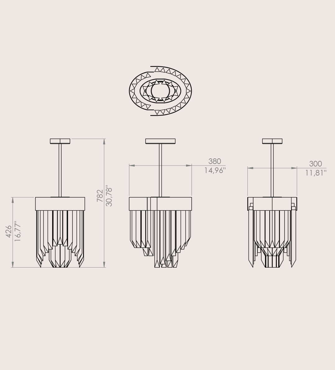 | Note | Disegno tecnico, dimensioni e lampadine si riferiscono alla variante della foto principale. Le dimmerazioni a richiesta potrebbero comportare l'aumento delle dimensioni del rosone. Per varianti cromatiche disponibili, consultare la scheda tecnica. |