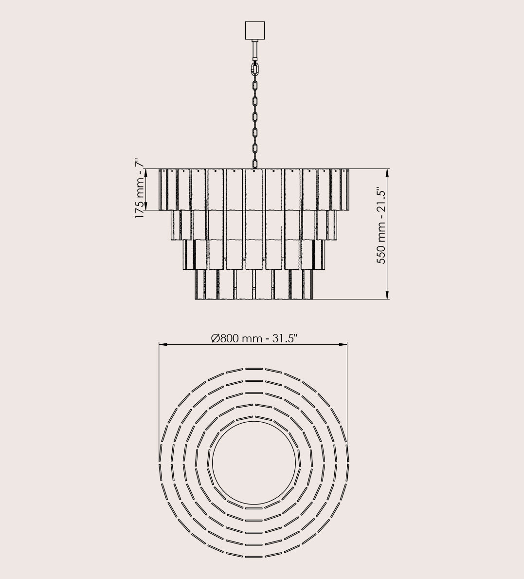 | Note | Disegno tecnico, dimensioni e lampadine si riferiscono alla variante della foto principale. Le dimmerazioni a richiesta potrebbero comportare l'aumento delle dimensioni del rosone. Per varianti cromatiche disponibili, consultare la scheda tecnica. |