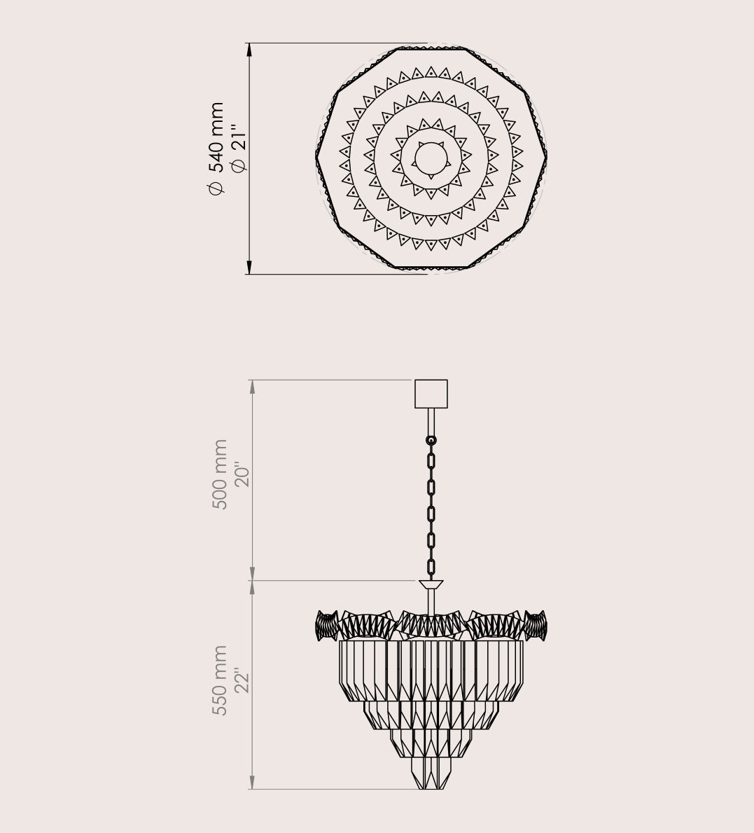 | Note | Disegno tecnico, dimensioni e lampadine si riferiscono alla variante della foto principale. Le dimmerazioni a richiesta potrebbero comportare l'aumento delle dimensioni del rosone. Per varianti cromatiche disponibili, consultare la scheda tecnica. |