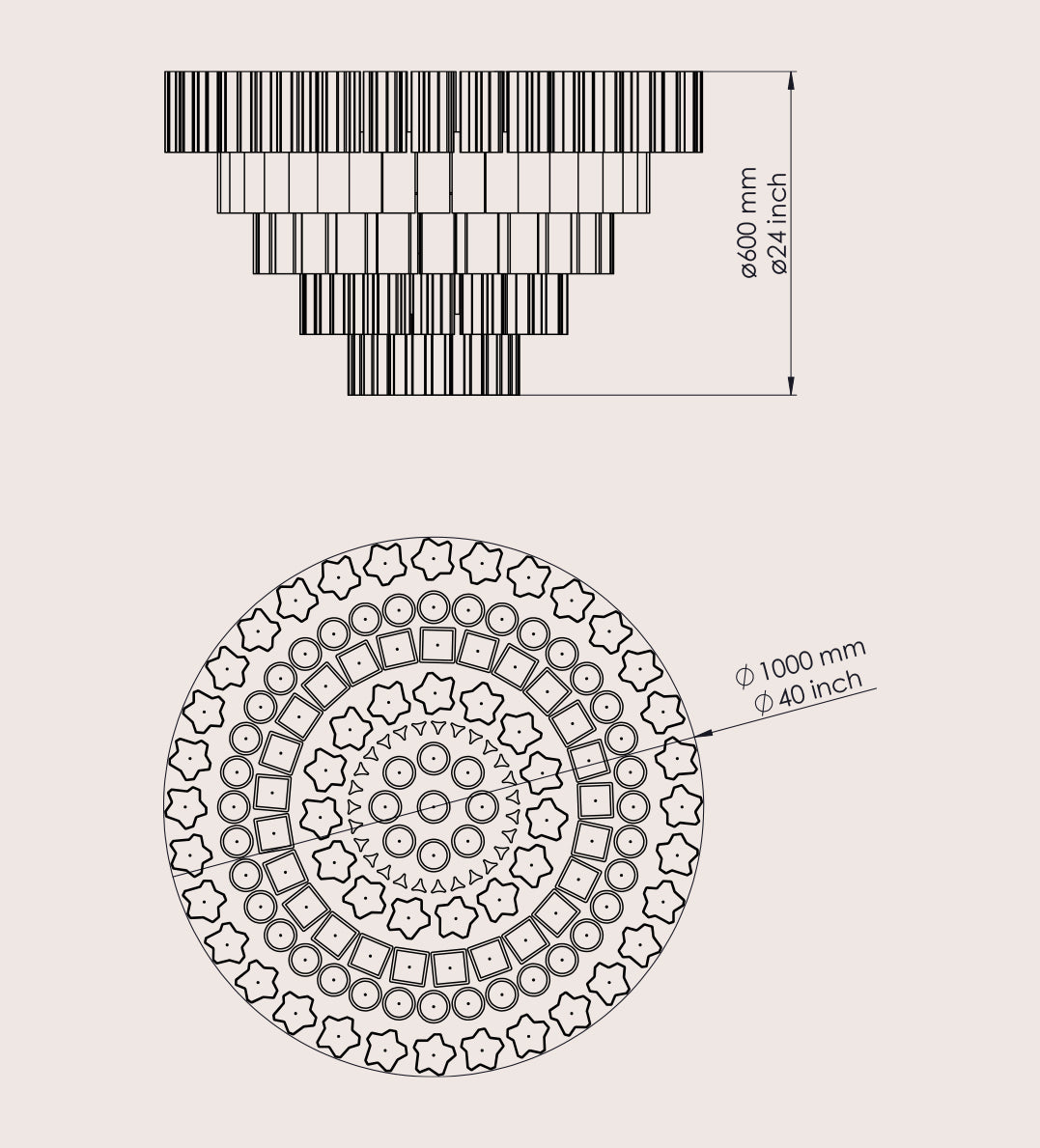 | Note | Disegno tecnico, dimensioni e lampadine si riferiscono alla variante della foto principale. Le dimmerazioni a richiesta potrebbero comportare l'aumento delle dimensioni del rosone. Per varianti cromatiche disponibili, consultare la scheda tecnica. |