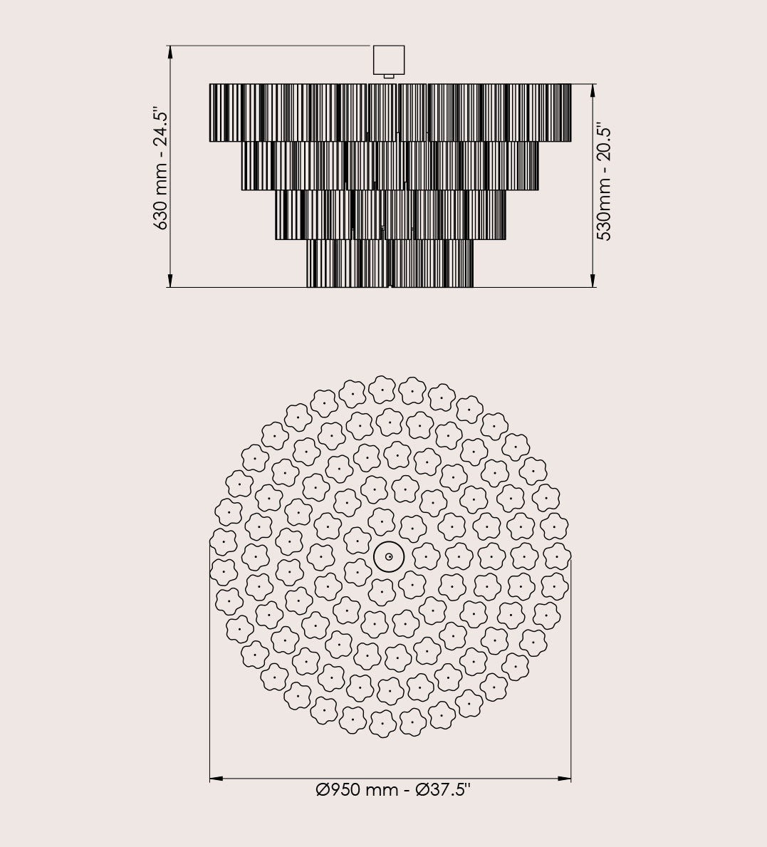 | Note | Disegno tecnico, dimensioni e lampadine si riferiscono alla variante della foto principale. Le dimmerazioni a richiesta potrebbero comportare l'aumento delle dimensioni del rosone. Per varianti cromatiche disponibili, consultare la scheda tecnica. |