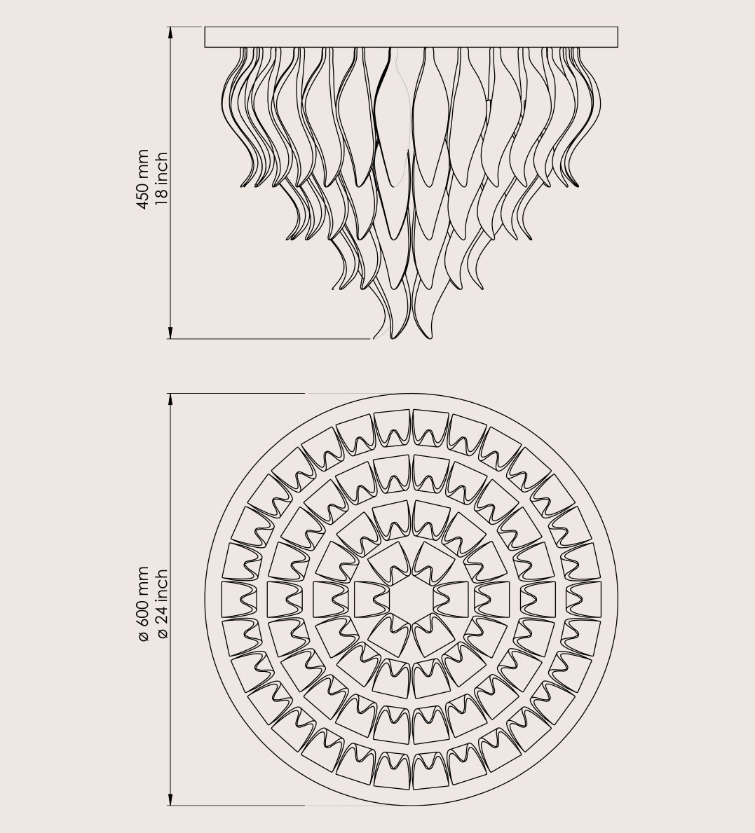 | Note | Disegno tecnico, dimensioni e lampadine si riferiscono alla variante della foto principale. Le dimmerazioni a richiesta potrebbero comportare l'aumento delle dimensioni del rosone. Per varianti cromatiche disponibili, consultare la scheda tecnica. |