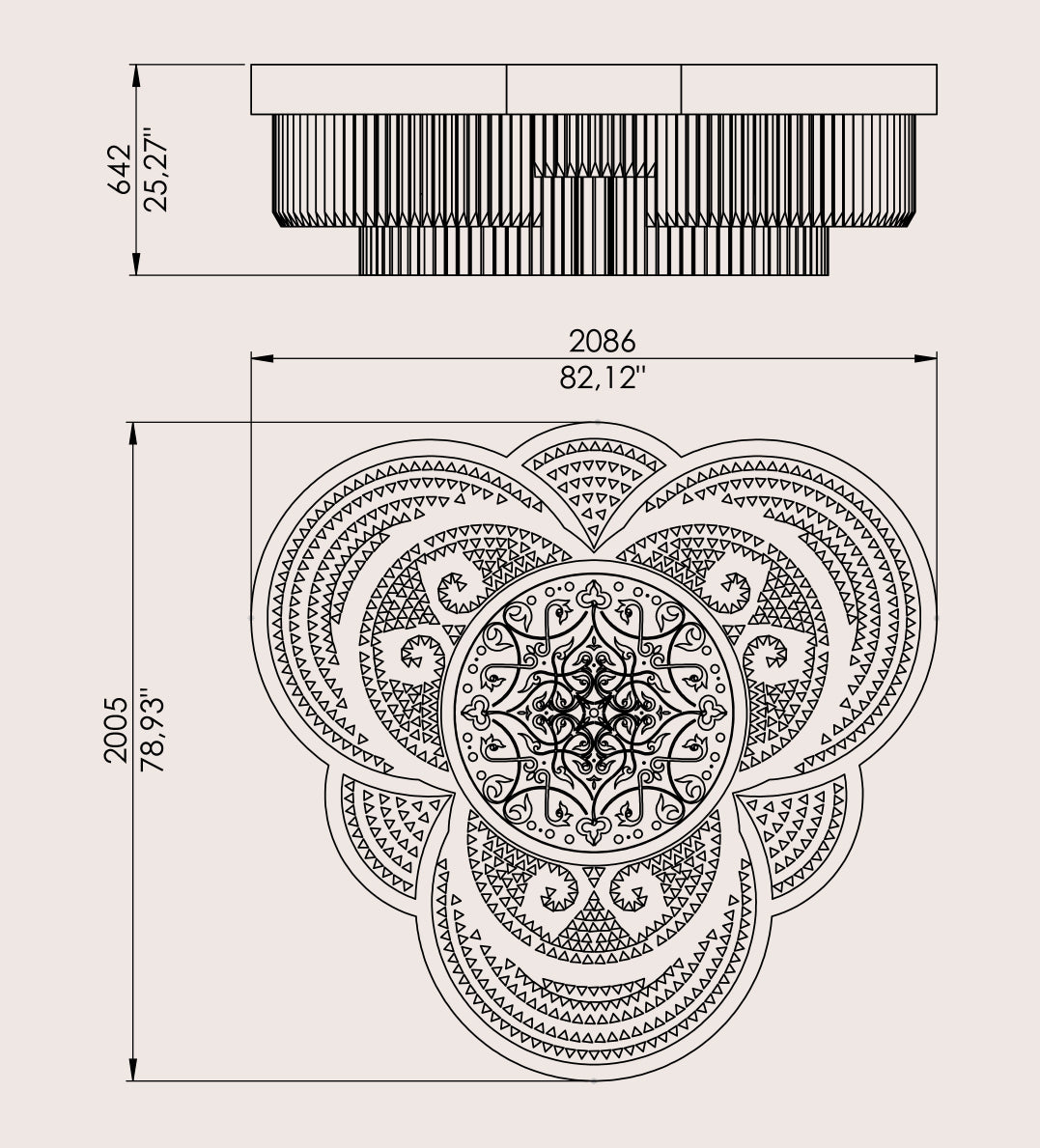 | Note | Disegno tecnico, dimensioni e lampadine si riferiscono alla variante della foto principale. Le dimmerazioni a richiesta potrebbero comportare l'aumento delle dimensioni del rosone. Per varianti cromatiche disponibili, consultare la scheda tecnica. |